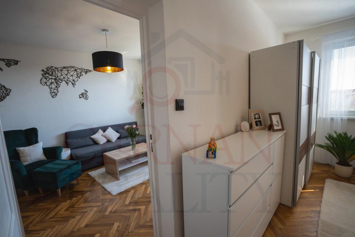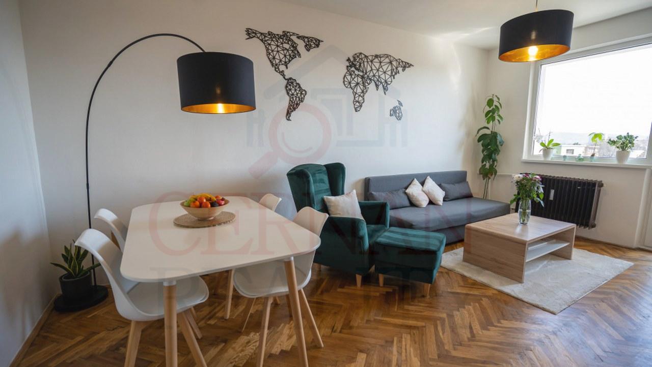 Byt je kompletne zrekonštruovaný: nová kuchynská linka, zabudované spotrebiče: plyn. varná doska, el. rúra, umývačka riadu – ostávajú v byte. V celom byte sú plastové okná. Drevené parkety sú vynovené a ošetrené, murované jadro, nový sprchovací kút aj WC.