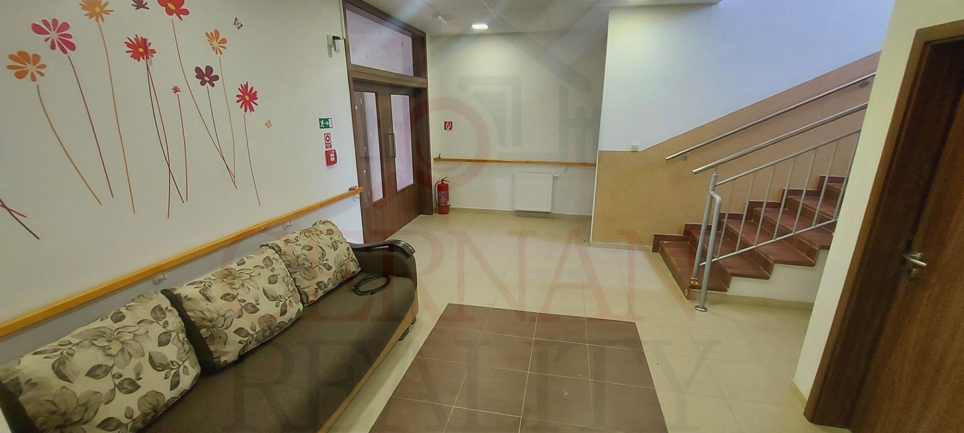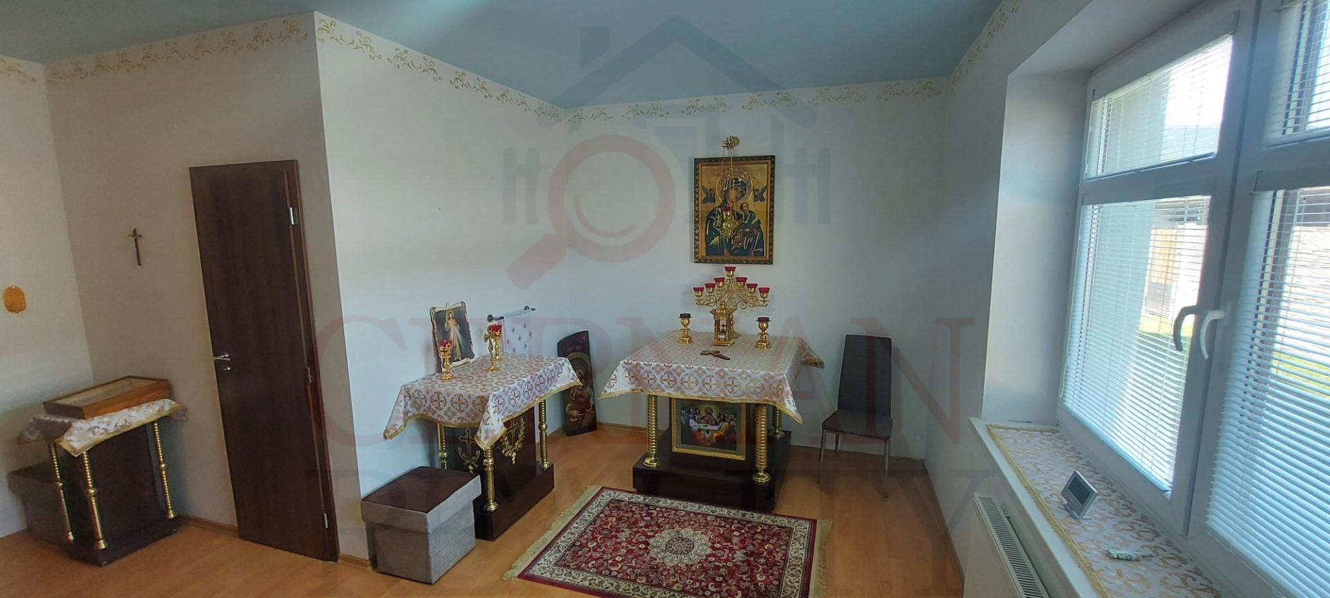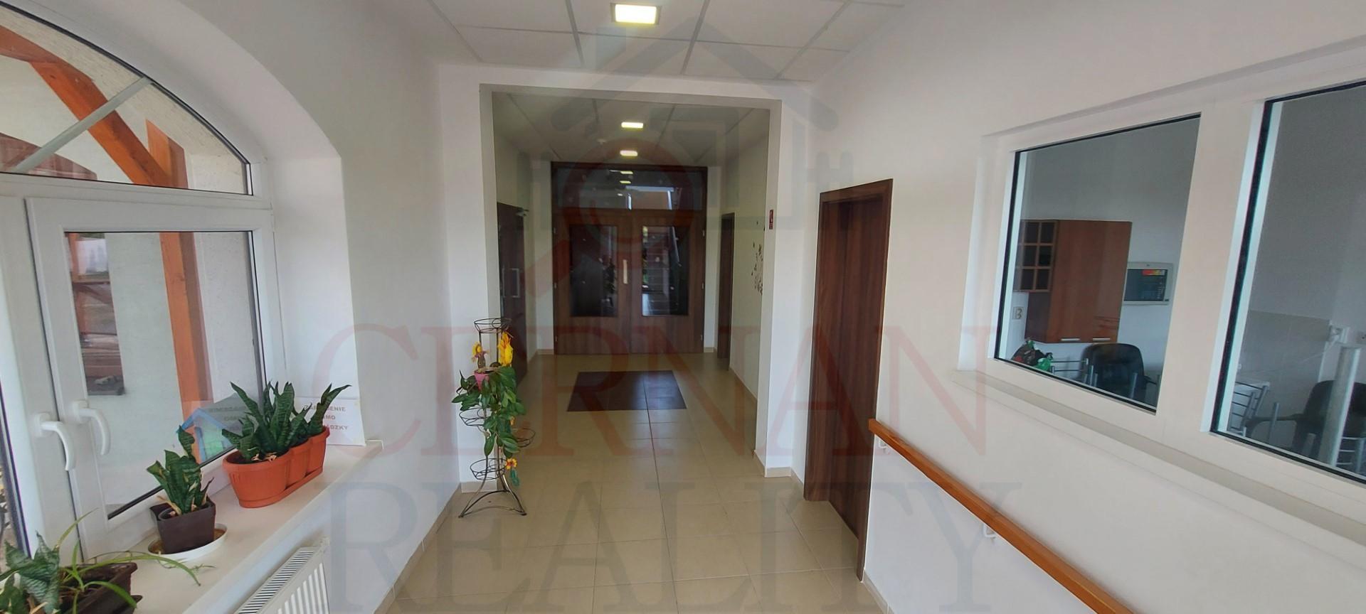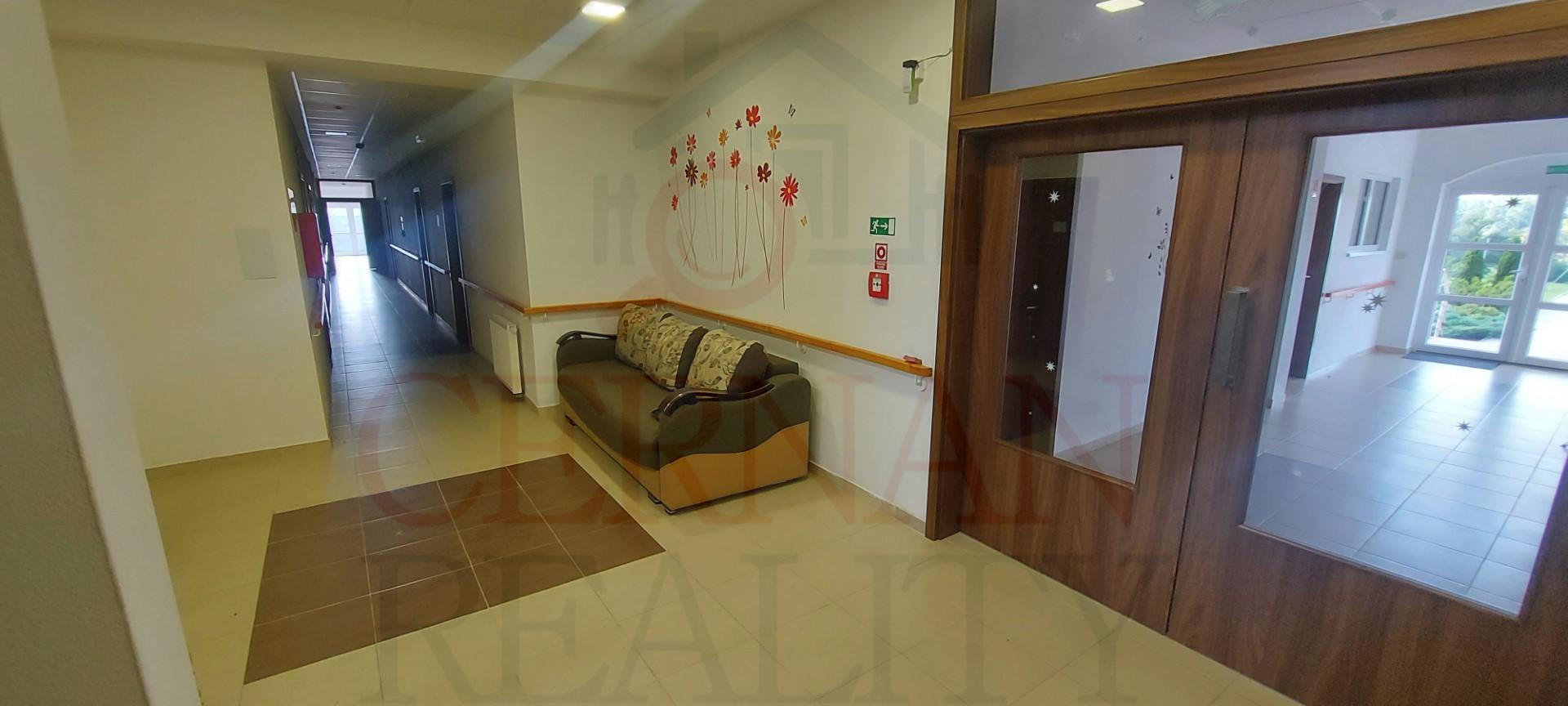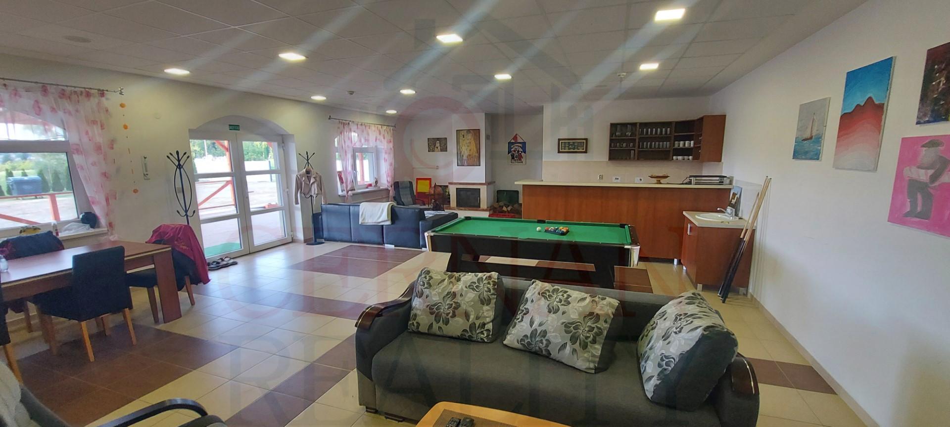Vybavenie interiéru: veľká spoločenská miestnosť s krbom a barom s vlastným vstupom z exteriéru, recepcia, kancelária, kompletne vybavená kuchyňa s výdajnými okienkami stravy, fínska sauna, relaxačná zóna, práčovňa, žehliareň, sušiareň, šatne pre personál, rôzne sklady, modlitebná miestnosť/kaplnka, technická miestnosť (vchod z exteriéru). Internet s WIFI v celom objekte. Plastové okná v celom objekte.